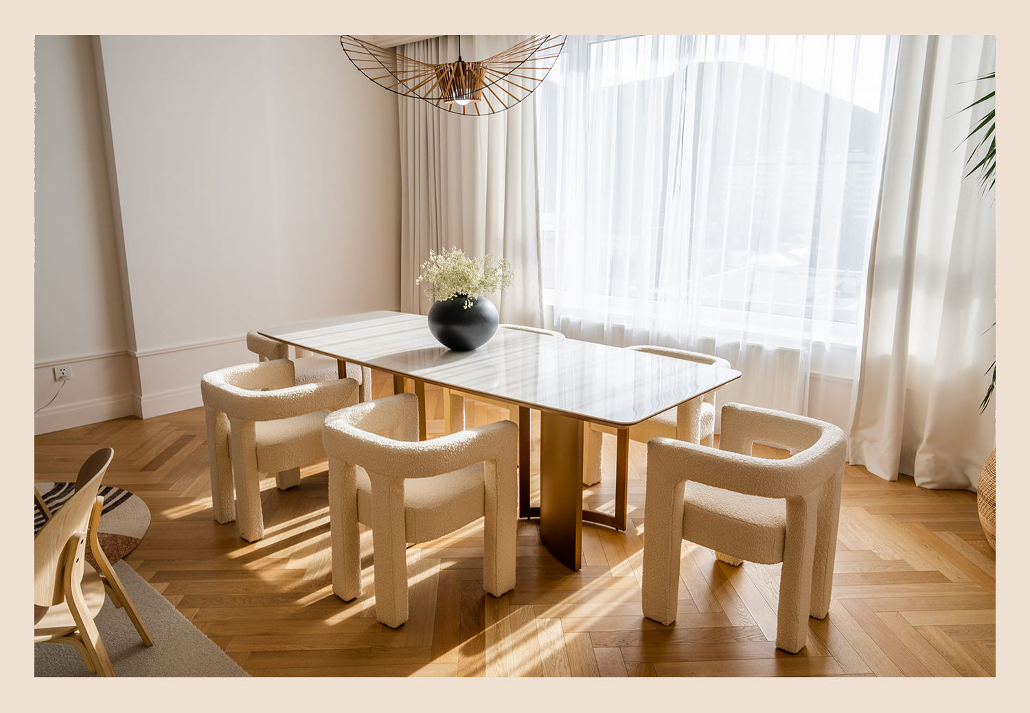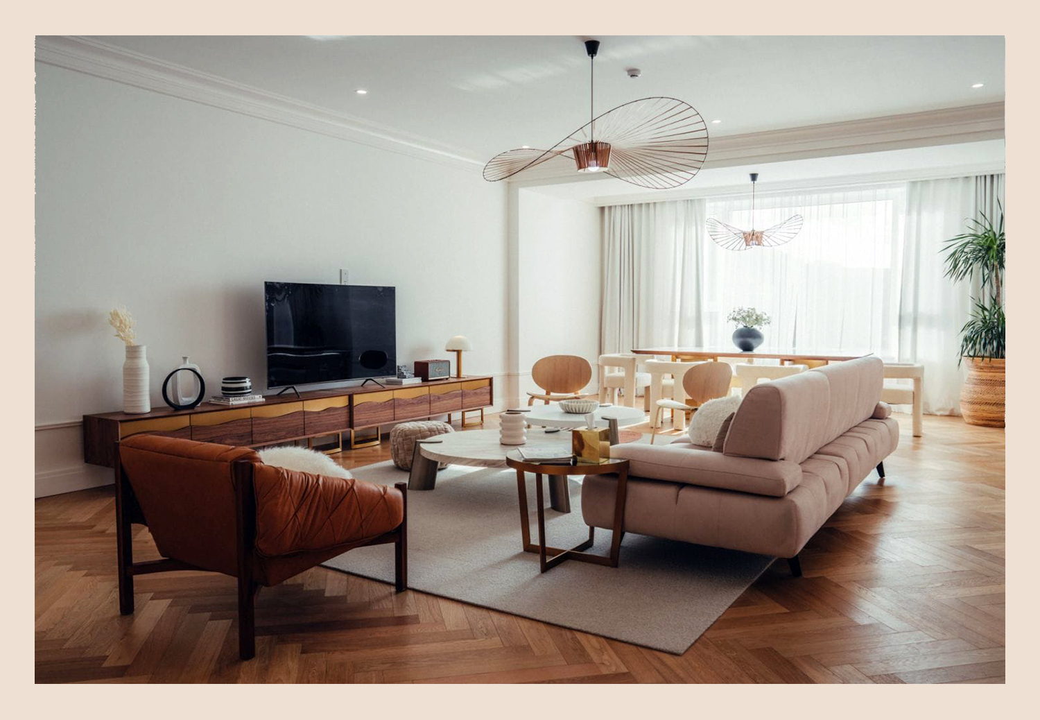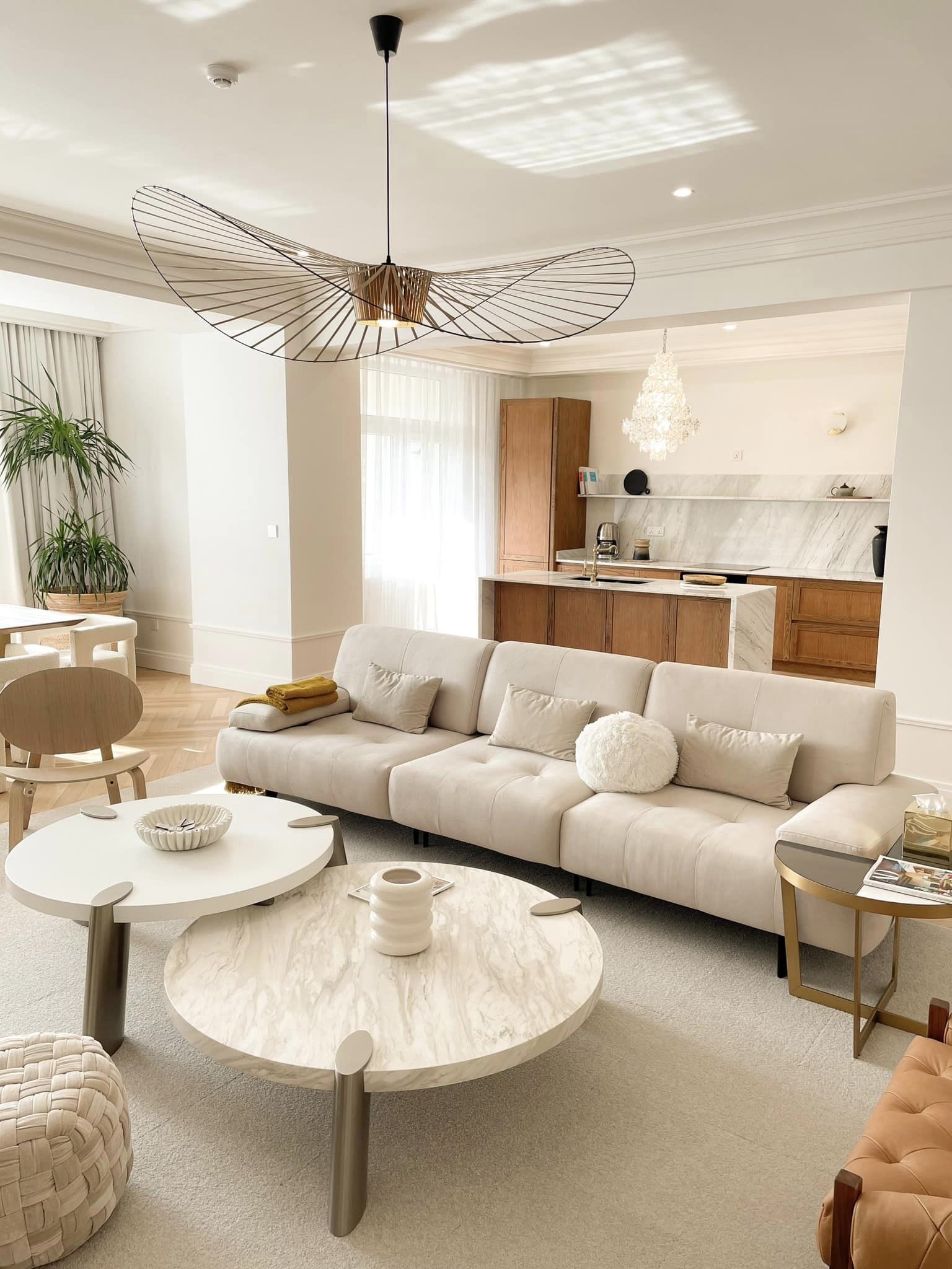 үйлчилгээтэй орон сууц нь орчин үеийн болон сонгодог загварыг хослуулан төлөвлөсөн өндөр таазтай,